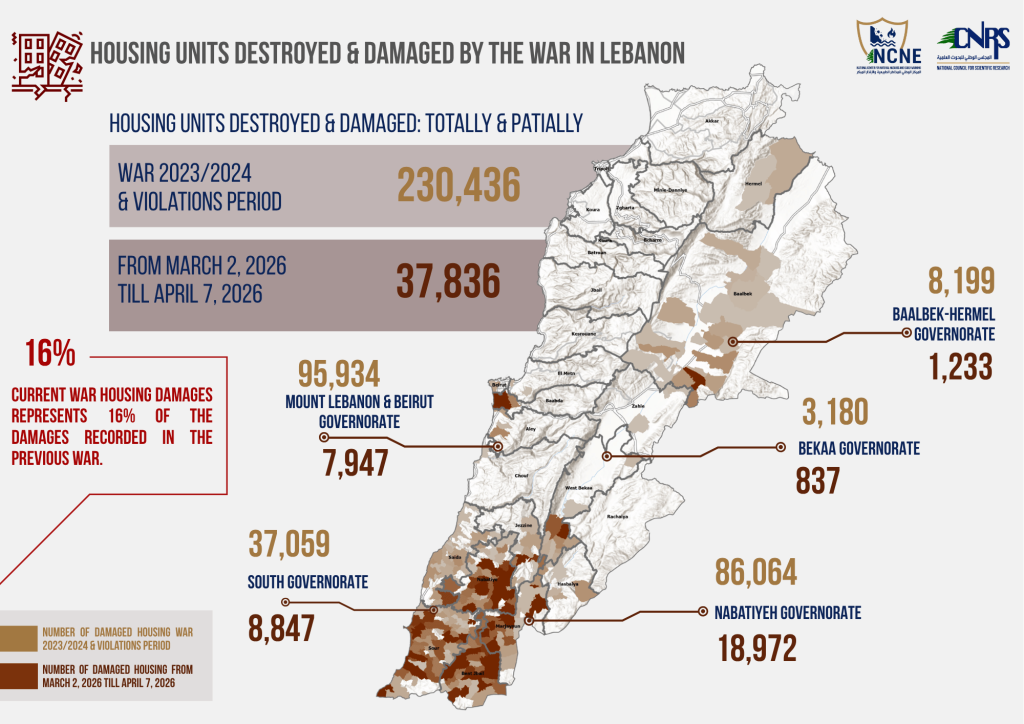 As part of ongoing efforts to monitor and document the systematic destruction and escalating attacks on Lebanon, the National Council for Scientific Research – Lebanon (CNRS-L), through the National Center for Natural Hazards and Early Warning (NCNE), presents its latest assessment of damage in the housing sector.